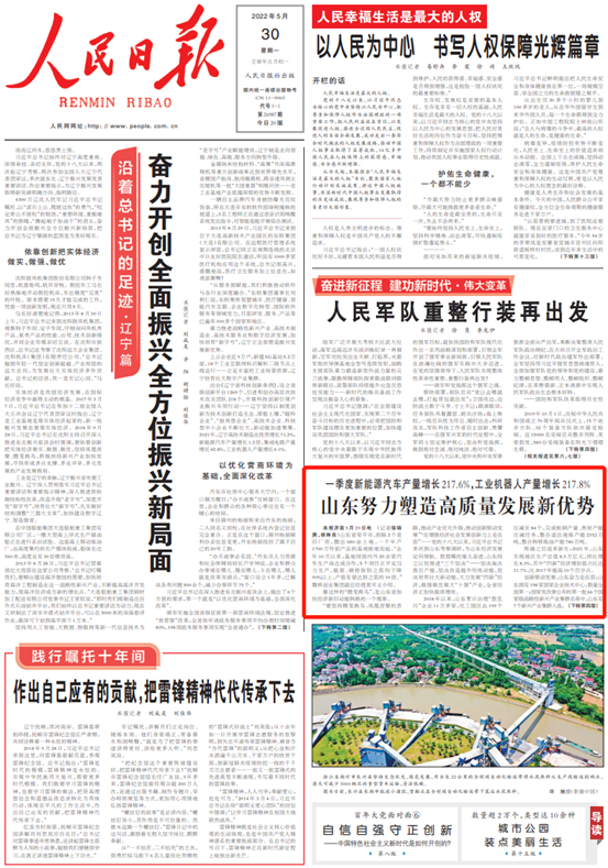 编者按:正值喜迎党的二十大胜利召开之际,山东省第十二次党代会召开期间,今天人民日报头版刊发重磅文章,讲述山东牢记习近平总书记嘱托,坚持“腾笼换鸟、凤凰涅槃”的思路,持之以恒推进“三个坚决”,新旧动能转换加速,全省经济正提质增效。文章表达,山东将坚持以习近平新时代中国特色社会主义思想为指导,深入贯彻落实习近平总书记对山东工作的重要指示要求,牢记嘱托走在前,勇担使命开新局,奋力在高质量发展上趟出一条路子。全文如下: