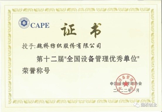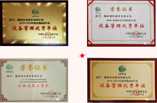 2013-2014年获纺织行业“设备管理优秀单位”,2018年荣获第十一届全国“设备管理优秀单位”,2020年荣获第九届全国纺织企业“管理创新成果一等奖”,2020年申报的绿色智能项目《基于数字化、信息化的智能纺纱企业管理模式创新》获得全国纺织行业“管理创新成果”一等奖,2020年工业和信息化部发布了《关于公布第五批绿色制造名单的通知》,魏桥纺织入选绿色工厂名单。