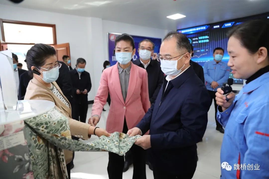 集团公司党委书记、总经理张红霞陪同段青英到魏桥特宽幅绿色智能印染工厂升级改造项目实地调研。调研过程中,段青英听取了张红霞对我集团以“双碳”目标为导向,围绕“科技、绿色、时尚”产业发展定位,打造集“智能纺织、智能染整、智能服装、智能家纺”于一体全产业链智能工厂的相关介绍,观看了公司新研发的温变印花时尚创意系列产品、绿色天然植物染色产品和生态环保系列展示产品,并走进车间察看了解了设备运行状态和绿色、低耗的生产工艺流程。