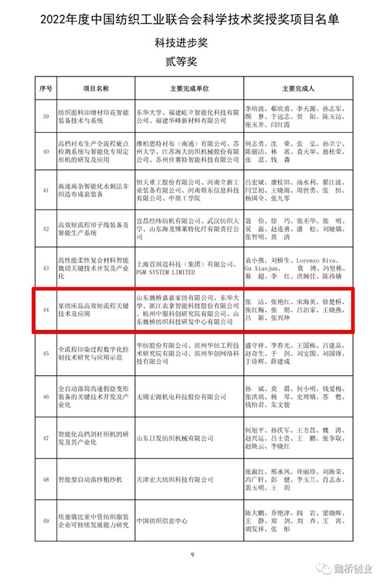 2022年12月29日,2022年度中国纺织工业联合会科学技术奖授奖项目名单正式公布,嘉嘉家纺“家纺床品高效短流程关键技术及应用” 项目荣获“科技进步奖”二等奖。