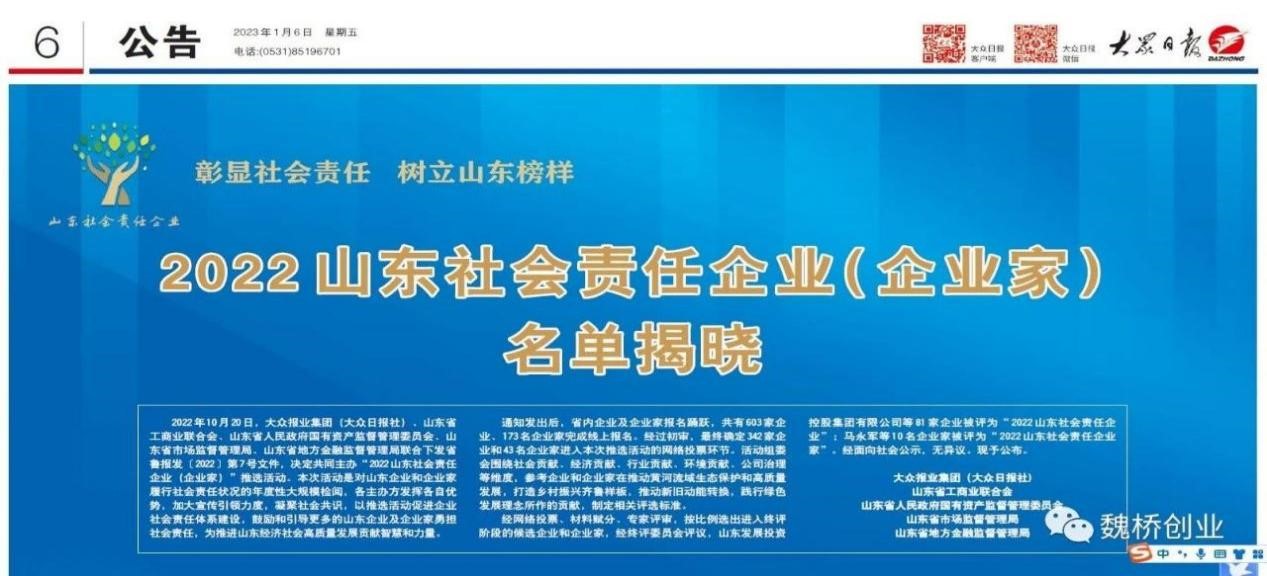 1月6日,由大众报业集团(大众日报社)、山东省工商业联合会、山东省人民政府国有资产监督管理委员会、山东省市场监督管理局、山东省地方金融监督管理局联合主办的“2022山东社会责任企业(企业家)”榜单公布,山东魏桥创业集团等81家企业入选“2022山东社会责任企业”,山东魏桥创业集团董事长张波等10人被评选为“2022山东社会责任企业家”。