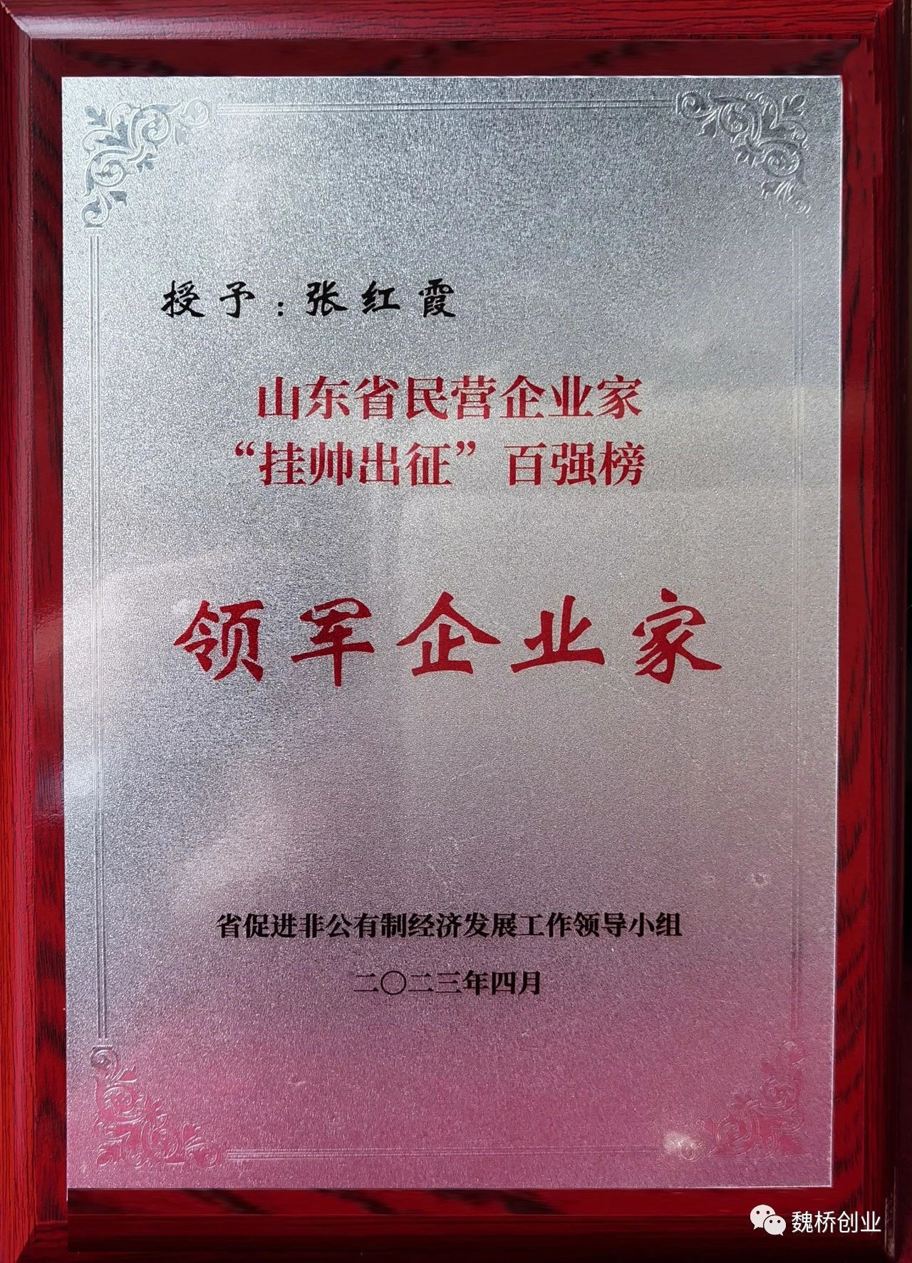 4月20日上午,山东省民营经济高质量发展工作会议在济南召开。会上,宣读了山东省民营经济高质量发展先进县(市、区)评价情况通报,发布了山东省民营企业家“挂帅出征”百强榜。与会省领导为获奖单位和个人授牌。2022年度省民营企业家“挂帅出征”百强榜名单包括30名领军型企业家、40名菁英型企业家及30名新星型企业家。山东魏桥创业集团党委书记、总经理张红霞被授予山东省民营企业家“挂帅出征”领军型企业家,受到表彰。