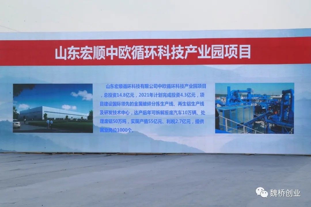 山东宏顺循环科技有限公司中欧循环科技产业园项目总投资14.8亿元,2021年计划完成投资4.3亿元,项目建设国际领先的金属破碎分拣生产线,再生铝生产线及研发技术中心,达产后年可拆解报废汽车10万辆、处理废铝50万吨,实现产值55亿元、利税2.7亿元,提供就业岗位1000余个。