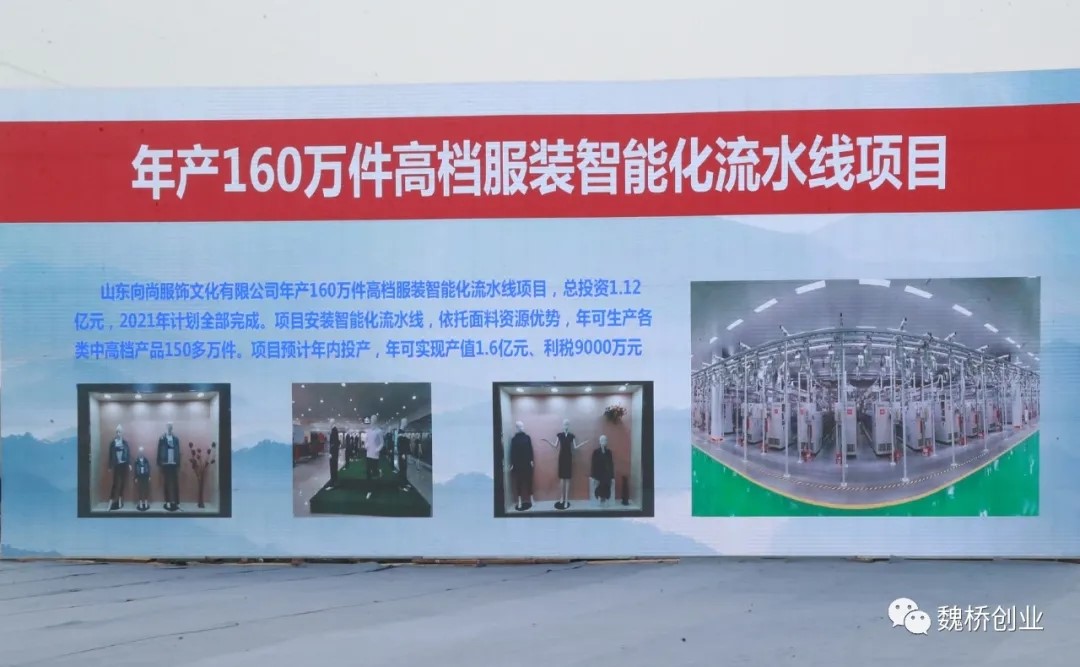 山东向尚服饰文化有限公司年产160万件高档服装智能化流水线项目,总投资1.12亿元,2021年计划全部完成。项目安装智能化流水线,依托面料资源优势,年可生产各类中高档产品150多万件。项目预计年内投产,年可实现产值1.6亿元。
