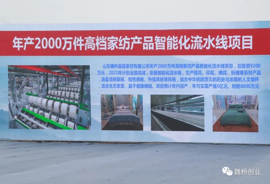 山东魏桥嘉嘉家纺有限公司年产2000万件高裆家纺产品智能化流水线项目,总投资9200万元,2021年计划全部完成,安装智能化流水线,生产提花、印花、绣花、绗缝等系列产品,涵盖清新靓丽、知性典雅、热情奔放等风格,结合中华民族悠久的历史与浓厚的人文情怀,适合生态家居,益于健康睡眠。项目预计年内投产,年可实现产值5亿元、利税8000万元。