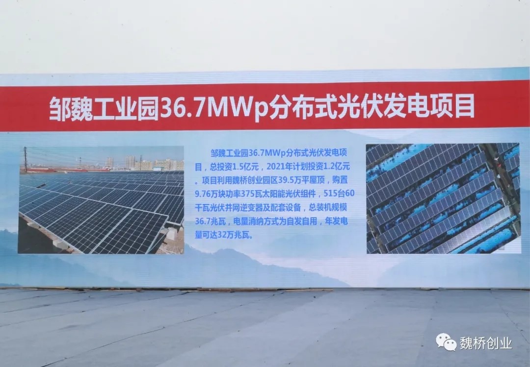 邹魏工业园36.7MWp分布式光伏发电项目,总投资1.5亿元,2021年计划投资1.2亿元。项目利用魏桥创业园区39.5万平屋顶,购置9.76万块功率375瓦太阳能光伏组件,515台60干瓦光伏并网逆变器及配套设备,总装机规模36.7兆瓦,电量消纳方式为自发自用,年发电量可达32万兆瓦。